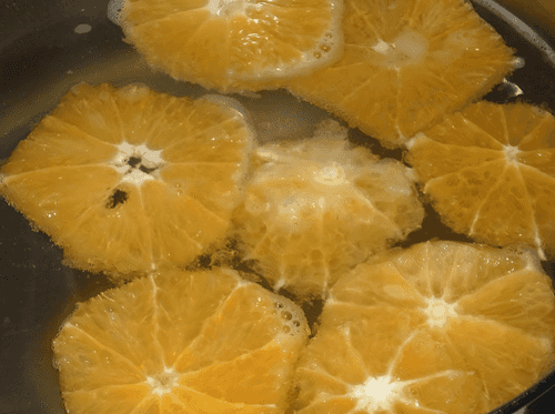 We cut the oranges into circles or any convenient pieces, but not large. I don't cut the lemons, just squeeze the juice.