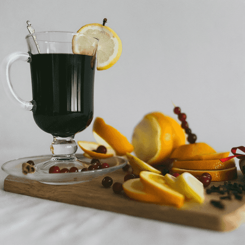 Mulled wine with fruits and spices is a drink that warms the soul and body, with roots tracing back to medieval Europe. It was prepared at markets and fairs by adding spices to preserve the wine's aroma. This version with oranges, lemons, and apples gives the drink a rich fruity flavor, while cinnamon and cloves create a warm, cozy scent. It's perfect for cold evenings, holidays, or gatherings with friends. The sweetness of honey softens the wine's bitterness, and a glass rimmed with sugar makes the presentation special. Serve hot and enjoy its invigorating taste and deep aroma.
