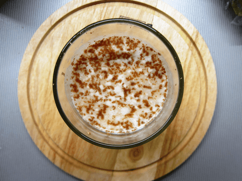 Put all ingredients except grated chocolate and ice into the mixer and whip until it reaches a whipped cream consistency.