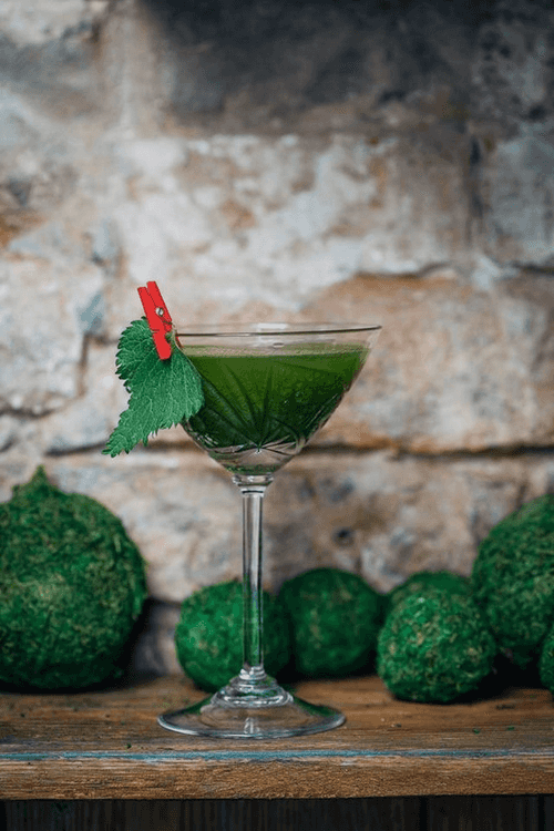 Then go outside and pick some nettles. Separate the leaves, blanch them, and put them in a blender. Add syrup and lemon juice. Blend everything, then strain to remove the pulp.