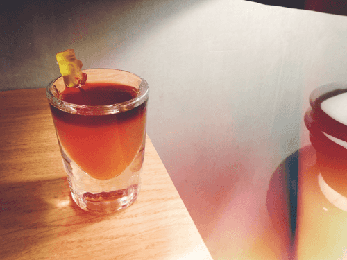 The cocktail 'Mishka' is a playful and cozy drink that combines the sweetness of childhood memories with the sophistication of Russian cuisine. Its base is sea buckthorn tincture on gin, complemented by deep berry notes of blackcurrant liqueur. The drink has a bright sweet-and-sour taste with light resinous hints of sea buckthorn and rich blackcurrant astringency. The finishing touch is a gummy bear nestled on a toothpick, adding not only visual appeal but also pleasant sweetness at the end. 'Mishka' is perfect for friendly gatherings and cozy evenings, creating an atmosphere of lightness and warmth. This cocktail is a small journey into the world of childhood and at the same time an exquisite adult dessert in a glass.