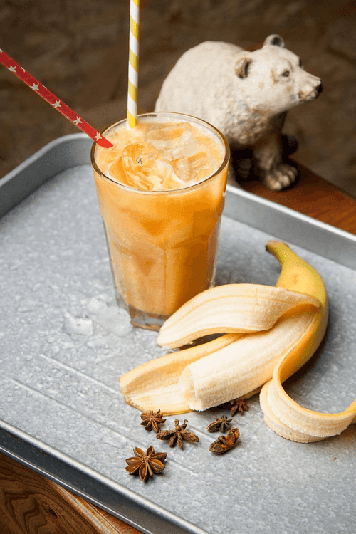 Blend half a banana and add it to the cocktail. Pour in banana syrup.