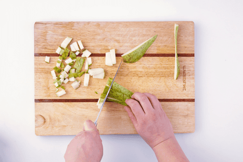 Chop the pear finely, sprinkle with sugar and cinnamon, add a little water to prevent burning, and simmer on low heat for 5-10 minutes.