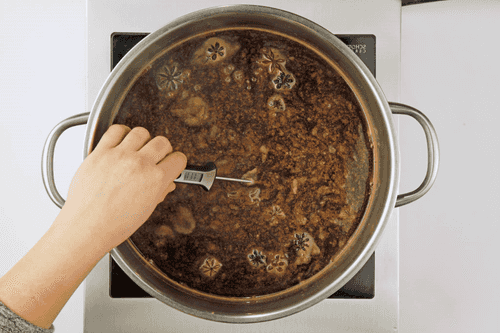 Add winter spices - nutmeg, star anise, a bit of clove, and honey. Heat it all to 60 degrees. It can be served after dinner.