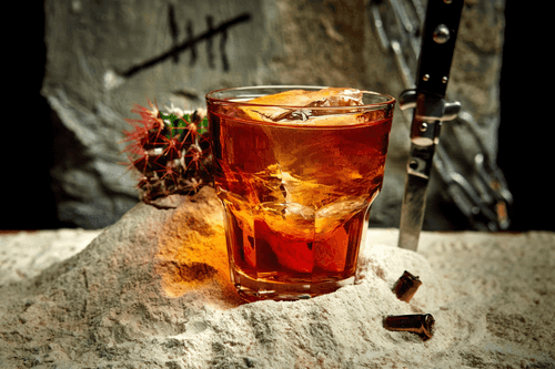 Pour red and dry vermouth, Aperol, tequila, and whiskey into a mixing glass with ice. Stir with a bar spoon.