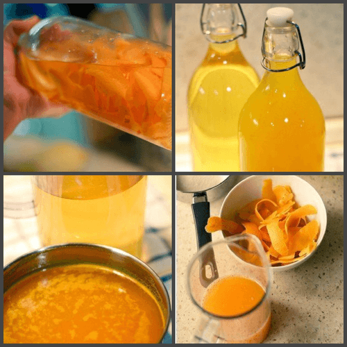 Preparation time: 1 hour of total work + 7-8 days of infusion. Wash the oranges and carefully peel them. Try not to touch the white pith, as too much can make the liqueur bitter. It's easiest to peel using a vegetable peeler, making thin strips. Place all the peel in a jar, cover with vodka, and store in the refrigerator or another cool, dark place for 5 days.