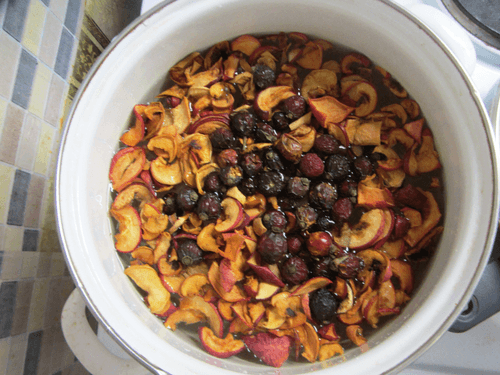 Then add rose hips and dried apples to boiling water, and cook the compote for at least 30 minutes.