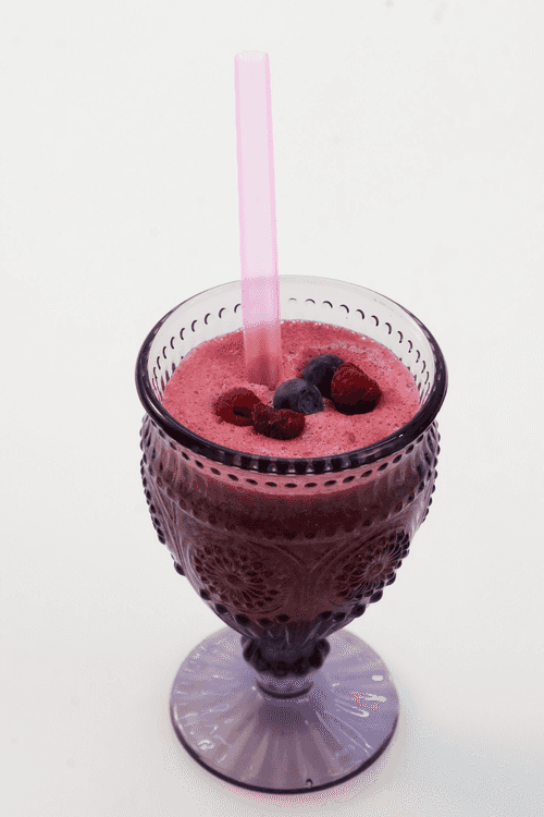 Put banana, berries, and ice in the blender. Pour in juice and blend for 45 seconds.