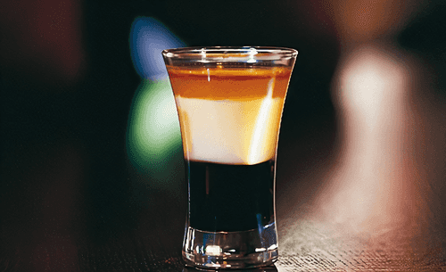 This cocktail is prepared by layering the ingredients directly into a pousse café glass or a tall, narrow glass.