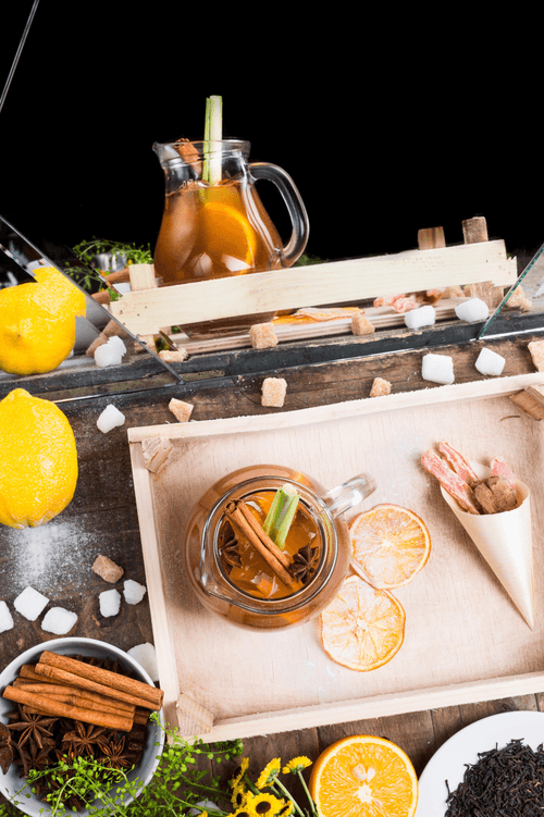 Decorate with lemongrass, orange, cinnamon, star anise, and powdered sugar.