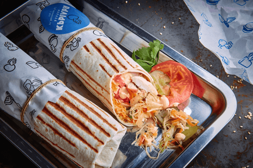 Chicken 'Wings' shawarma is a fragrant dish of Arabic cuisine that combines crispy Armenian lavash, tender grilled chicken, and spicy kimchi sauce. The roots of shawarma trace back to the ancient Middle East where meat was roasted on a spit and wrapped in flatbreads. This chicken version with fresh vegetables and a spicy dressing offers a rich flavor—from juicy chicken to refreshing crunchy cabbage and carrots. A special emphasis is placed on cilantro, highlighting the exotic nature of the dish. The grilled wrap acquires an appetizing crispy crust, turning shawarma into an ideal snack or full meal. It’s a harmony of textures and flavors that awakens gastronomic emotions and transports you to the atmosphere of an Eastern bazaar filled with aromas of spices and fresh produce.