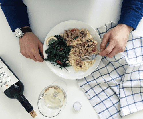 Pour sunflower (olive) oil into a preheated oven. Sauté mushrooms and garlic for 3 minutes. Then add half a glass of water, cream, and mustard to the mushrooms. Season with salt and pepper.