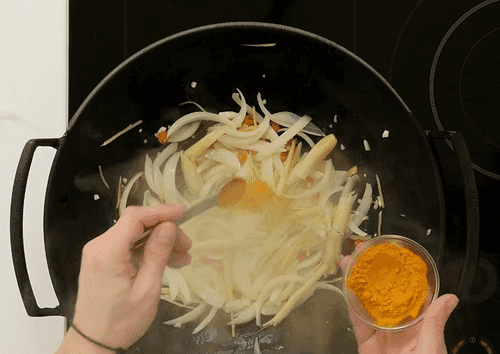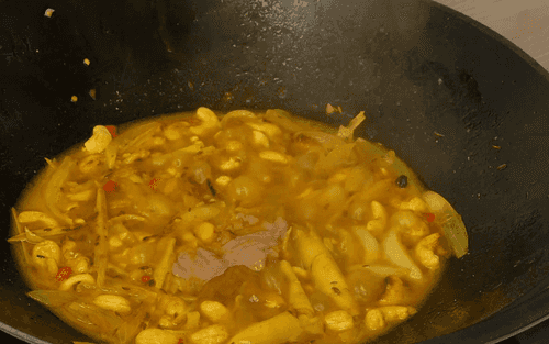 Then add lemongrass, bay leaf, turmeric, cashews, coriander, cumin, and cardamom.