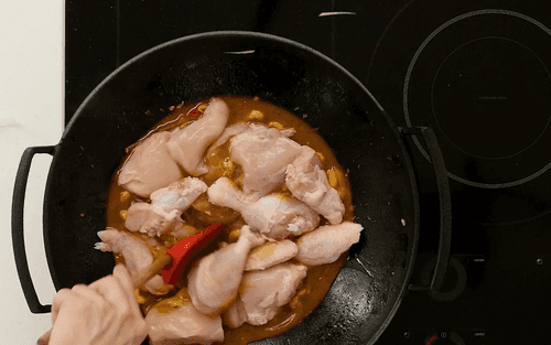 Add the chicken cut into large pieces and mix to coat the meat with the sauce.