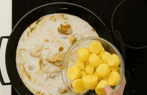 Pour in coconut milk and add chopped potatoes, stir, bring to a boil and reduce heat to low. Cook for 30-40 minutes, stirring occasionally.