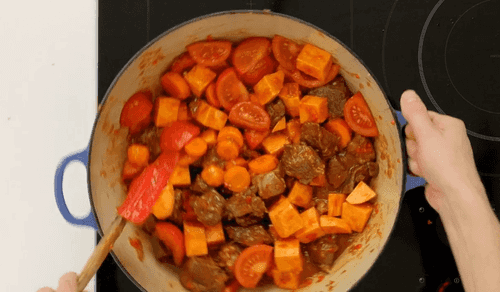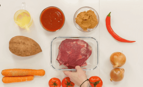 An African version of the meat stew, maafe. It contains sweet potato, carrot, tomato, passata and peanut butter, making it extremely rich. This sweetish stew is usually served with white rice, like curry.