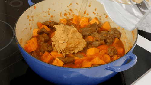 Add peanut butter and water, mix well, cover with a lid, and simmer for 1.5 hours on low heat.