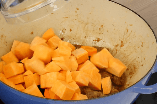Add coarsely chopped carrots and sweet potatoes.