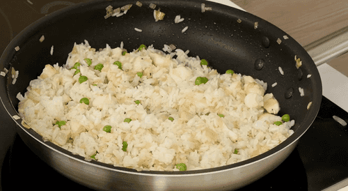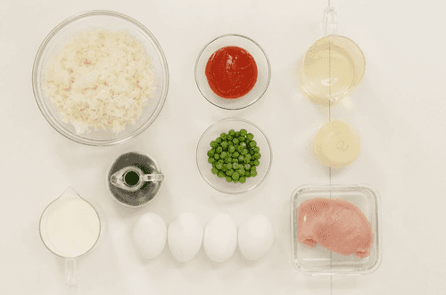 Add rice, mix well breaking up clumps, then add peas, ketchup and soy sauce, mix and remove from heat.
