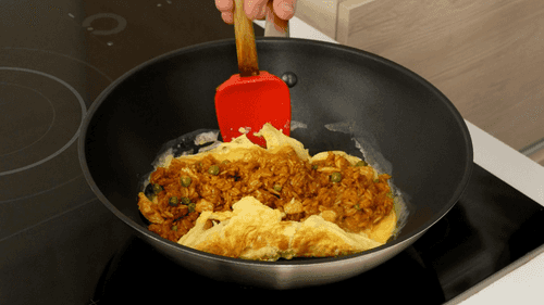 When the bottom of the omelet is cooked but the surface is still raw, turn off the heat and place half of the fried rice on top of the omelet.