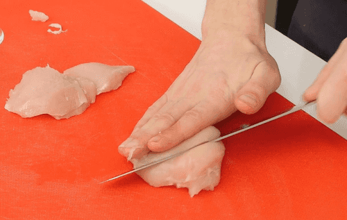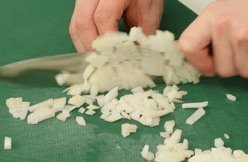 Then add finely chopped chicken, season with salt, and fry for a few minutes until the chicken is cooked.