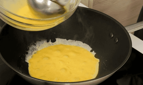 Pour the eggs into a heated wok or deep skillet. While the eggs are still runny, stir them with a spatula or chopsticks, as done in Japan, to give the omelet an airy texture.