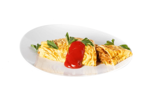 Fold the edges of the omelet over the rice, wrapping the filling in the omelet. Carefully transfer the omelet with rice to a plate by flipping the pan. Serve with ketchup, garnished with parsley.