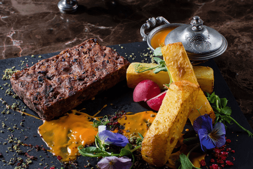 Garnish: clean the celery, cut into large long sticks, boil in broth, dry on a towel, and coat in starch. Pour oil into a saucepan, heat it up and fry the celery until golden brown.
