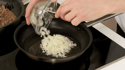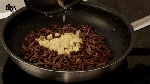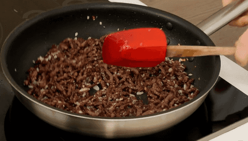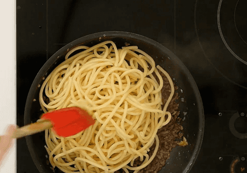 Drain the water and add the cooked pasta. Mix with the minced meat.