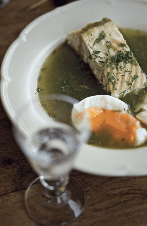 Remove the hard stems from the dill and chop it. Pour the soup into bowls. In each bowl, place a halved egg, a piece of sturgeon, and sprinkle with dill.