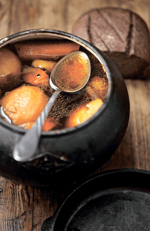 Place the pot in a preheated and slightly cooled oven. In old books, this mode was called 'after baking bread.' In a modern kitchen, preheat the oven to 200°C, then place the pot inside and reduce the temperature to 100–120°C. Keep the pot at this temperature uncovered for 5–6 hours (longer is also possible). In the oven, there's no need to lower or adjust anything; it will do everything right by itself. As it cools gradually, the oven will transfer its heat to the contents of the pot and turn it into a delicious dish.