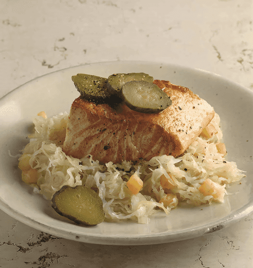The recipe is taken from the book "French regional cuisine" by Joël Robuchon and Loïc Bienassy. This is an old recipe, a classic of Alsatian cuisine. Choucroute with salmon was prepared on fasting days and during Lent. In a slightly modified form (one of the options is in the photo), this dish is still represented in the gastronomy of Alsace.