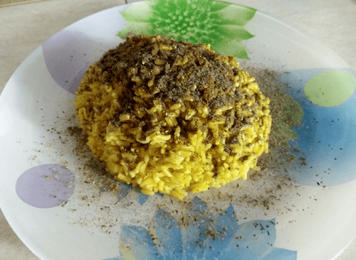 Add khmeli-suneli and black pepper to the rice. Mix well.