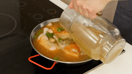 Add some broth if needed. Cook for 10 minutes on high heat, then reduce the heat to low and cook for another 10-15 minutes. Do not stir. The rice should slightly stick to the bottom of the pan.