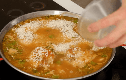 Pour in the rice, trying to distribute it evenly with the meat and vegetables in the pan.