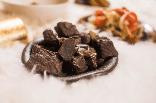 Heat oil in a pot, sauté the venison, add onion and spices to taste, then pour in red wine. Let it simmer on low heat for 2 hours (or until the meat is tender). As the liquid evaporates, add broth to the pot.