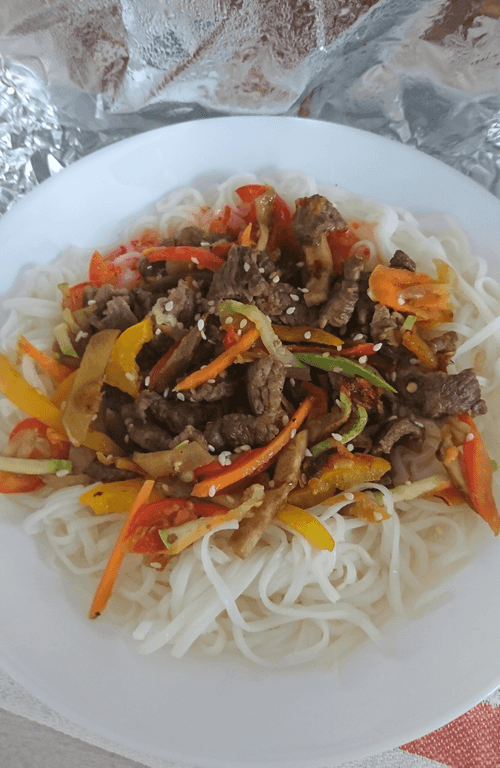 Фунчоза с говядиной и овощами — яркое блюдо паназиатской кухни, сочетающее нежность рисовой лапши, ароматную обжаренную говядину и свежие овощи. Его корни уходят в традиционные азиатские рецепты, где гармония вкусов достигается с помощью умелого баланса специй и текстур. Сладкий перец, морковь, баклажан и кабачок придают свежесть и хрусткость, а соевый соус добавляет насыщенность и глубину вкуса. Кунжут завершает композицию легкой ореховой ноткой. Блюдо подходит как для легкого ужина, так и для праздничного застолья, радуя богатством вкусов и эстетичной подачей. Оно отлично сочетается с зеленью и пикантными соусами, а фунчоза делает его универсальным и легкоусвояемым. Идеальное сочетание простоты приготовления и изысканности, которое покоряет сердца любителей азиатской кухни.