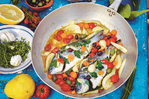Chop the onion, fennel, and carrot into pieces ½ cm thick. Cut the tomatoes in half. Thinly slice the garlic and chili. Crush the olives and remove the pits. Clean and gut the fish. Place a large pan over high heat and pour in 1 tbsp of olive oil. Add the onion, fennel, and carrot; after 4 minutes add the tomatoes, garlic, chili, and olives. Fry for 2 minutes while stirring. Make slight cuts on both sides of the fish and place half of the herbs inside.