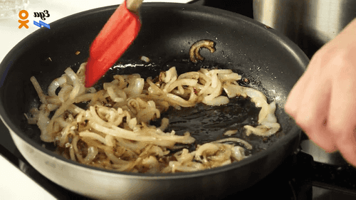 Heat 30 ml of vegetable oil and 50 grams of butter in a pan. Slice the onion into half rings and fry until golden.