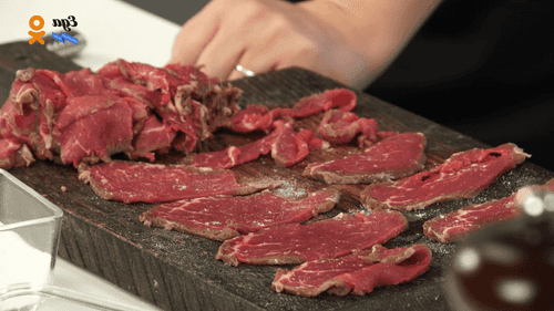 Cut the frozen meat into thin slices, season with salt and pepper, and pound with a mallet.