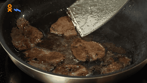 In another pan, heat vegetable oil with butter in the same amount as for the onion. Fry the beaten pieces of meat in batches on both sides for one minute.