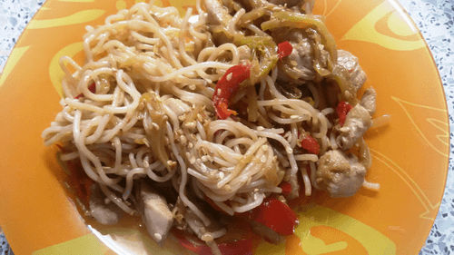 Noodles with zucchini and red pepper is a vibrant Pan-Asian dish that harmoniously combines the sweetness of bell pepper, the tenderness of chicken fillet, and the light freshness of zucchini. Rice noodles absorb the rich aromas of soy sauce and honey, creating a pleasant balance of flavors. The roots of the recipe trace back to Asian culinary traditions where simplicity in preparation and richness of flavors are valued. Toasted sesame adds nutty notes and a light crunch. This dish is perfect for a cozy home dinner or entertaining guests. Noodles with vegetables and chicken are light yet nutritious, and their exquisite taste shines even brighter when paired with green tea or a light Asian sauce. Enjoy your meal!