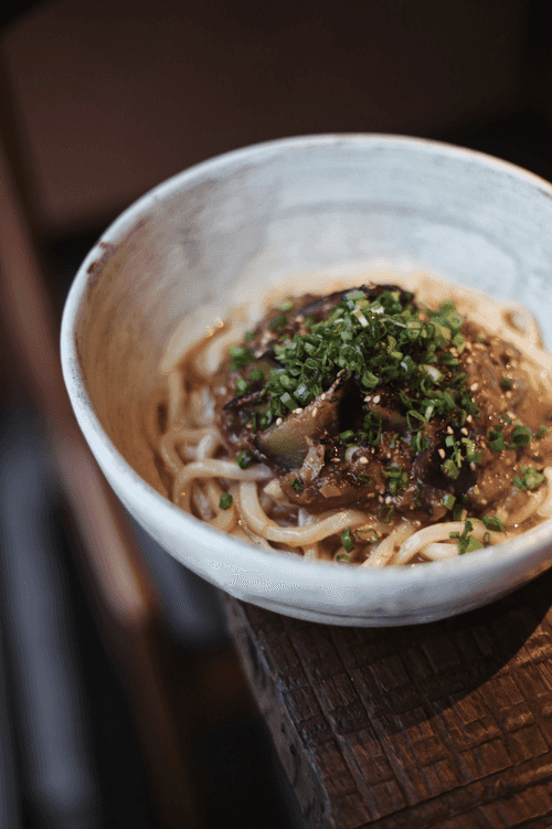 To cook udon, place frozen noodles in a sieve and submerge it in boiling water for 40 seconds, then drain to ensure no liquid remains in the udon. Season with soy sauce (70 g) and sesame oil (14 g), top with stew and fried eggplants, and sprinkle with green onions (35 g) and furikake.
