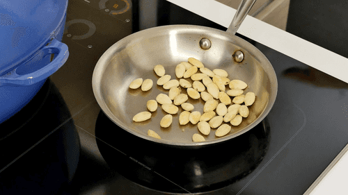 Roast the almonds in a dry pan until golden brown, stirring constantly.