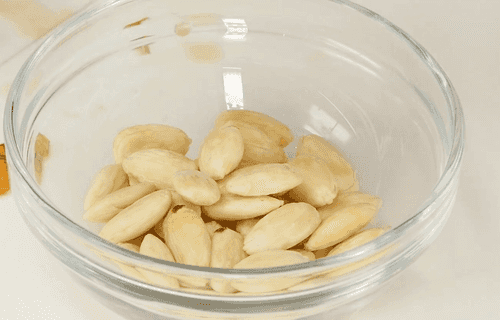 While the meat is simmering, pour hot water over the almonds, leave for 5 minutes, then peel and dry well.