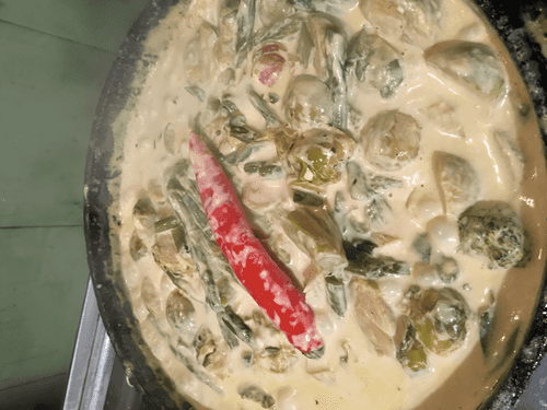 After a couple of minutes, add asparagus, chili pepper, cream and reduce the heat to a simmer.