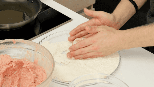 Dip your hands in cold water, shape the patty, coat it in flour, and send it to the pan with heated oil.