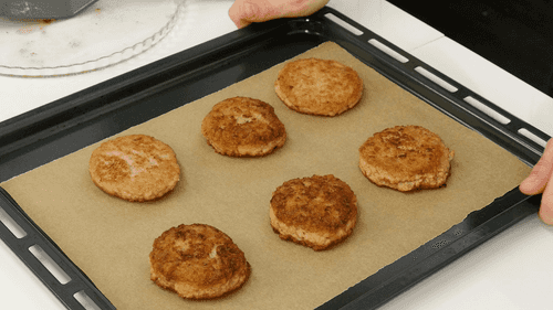 Transfer the fried cutlets to a baking sheet lined with parchment and place in an oven preheated to 180 degrees for 15 minutes.