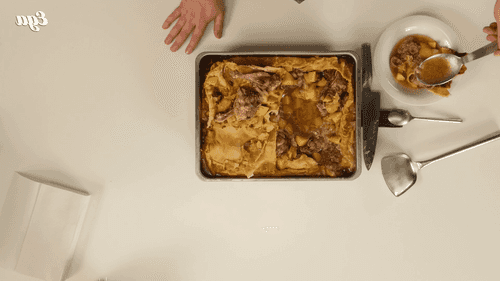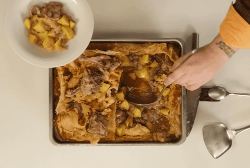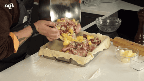 Take a kilogram of flour and add to it 500 grams of room temperature diced butter (so much butter is added to make the dough rich and prevent it from drying out during long cooking). Mix the butter with the flour in a mixer for about 5 minutes until they reach the texture of wet sand. Add a teaspoon of salt and ice water to the dough. Water should be added by eye, just enough to bind the ingredients. Mix the dough again but not for too long, no more than 2 minutes. Long mixing will make the dough elastic, which is not needed. Shape the dough into a hemisphere and refrigerate it for 20 minutes.