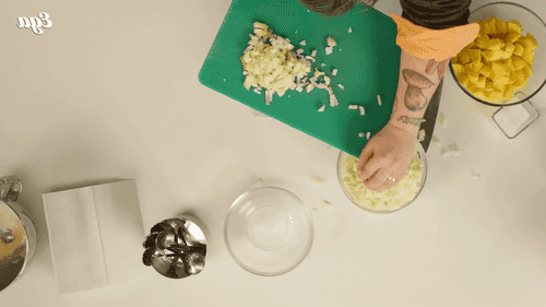 Mix duck pieces, onion, and potatoes. Add salt to taste. The salt should be about 2% of the filling's weight. Then add pepper; a lot of ground black pepper is needed. There are no other spices or seasonings in the belyash except for salt and pepper. Mix the filling well and let it sit to marinate a bit.